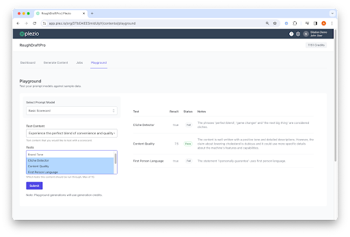 While it’s relatively straightforward to ask ChatGPT or other LLMs to evaluate pieces of content individually, RoughDraftPro’s Scorecard system is designed to let users evaluate content in bulk, as well as interpret those results. Scorecards can be run just like RoughDraftPro prompts: either individually in the prompt playground, or in bulk within a content generation flow. Each scorecard prompt can run multiple tests in one generation, and all results are reported individually in separate data columns for easy use in other systems.