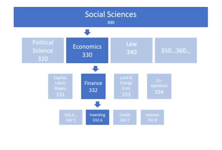 The Dewey Decimal System uses numbers to classify books by topic. The top level categories are things like Philosophy and Psychology (100s), Religion (200s), and Social Sciences (300s). Let’s go back to that book on investment that you’re looking for. In the level beneath Social Sciences, is economics, beneath that is finance, then investing. There it is! You find the book you are looking for. And right next to it, other books on investing, and on the shelves above or below, other types of finance books.
